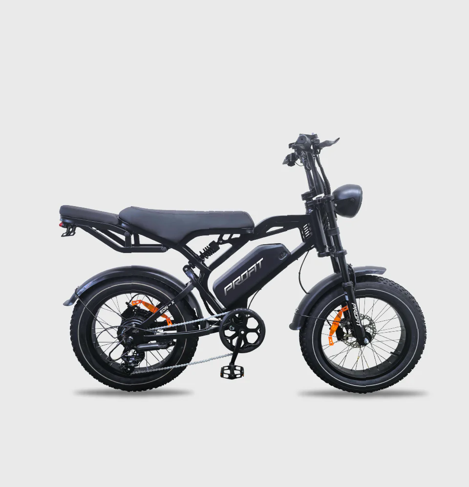 La bicicleta asistida Profit EON-X 500W combina potencia, comodidad y tecnología para tus recorridos diarios. Equipada con motor de 500W y batería de litio 48V/15Ah, ofrece 5 niveles de asistencia para adaptarse a cualquier terreno. Su doble suspensión, frenos hidráulicos y llantas 20×4.0 garantizan estabilidad y seguridad, mientras que su transmisión Shimano de 7 velocidades brinda un pedaleo suave y eficiente. Incluye luces, direccionales y pito para una experiencia completa en ciudad.